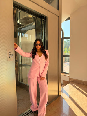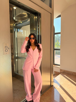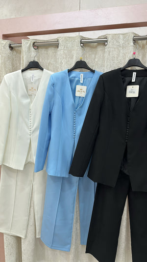 Tailleur con giacca con bottoncini e pantalone con elastico sul retro.